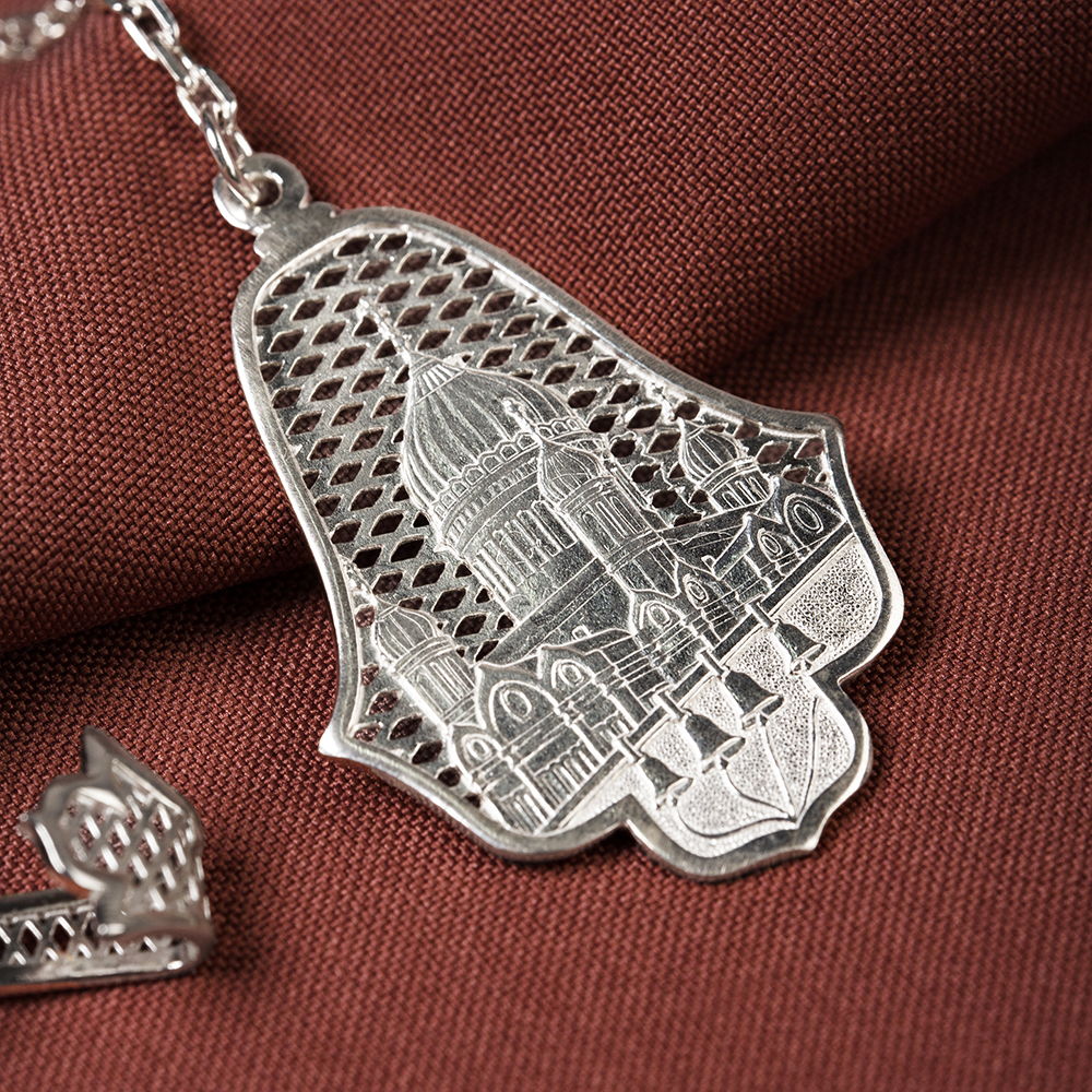 Ионизатор для воды изготовлен из качественного серебра, благодаря которому можно обогатить воду полезными химическими соединениями. Основная часть необычной декоративной формы украшена изображением православного храма на ажурной решетке. Крепление на цепочке имеет форму ажурного трилистника, превращая утилитарное изделие в оригинальный памятный подарок. Прочная цепь с якорным плетением надежно удерживает ионизатор, исключая его обрыв и утрату.
