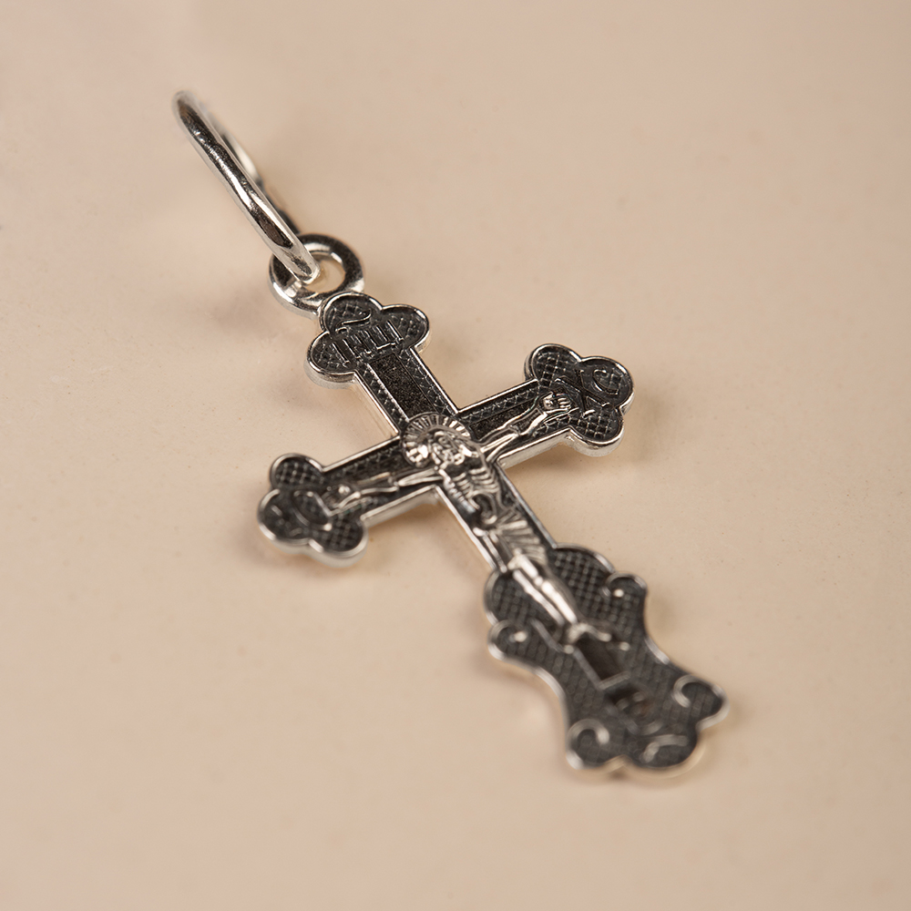 Нательный крест четырехконечной формы изготовлен из серебра методом штамповки. На лицевой стороне выполнено изображение Распятия с традиционными надписаниями. Рельеф текстов и изображений подчеркивает фон, обработанный по технологии частичного чернения. На тщательно отполированной обратной стороне изображен несложный узор, который дополняет текст краткой православной молитвы «Спаси и сохрани». Для ношения креста предусмотрена широкая проволочная петля.