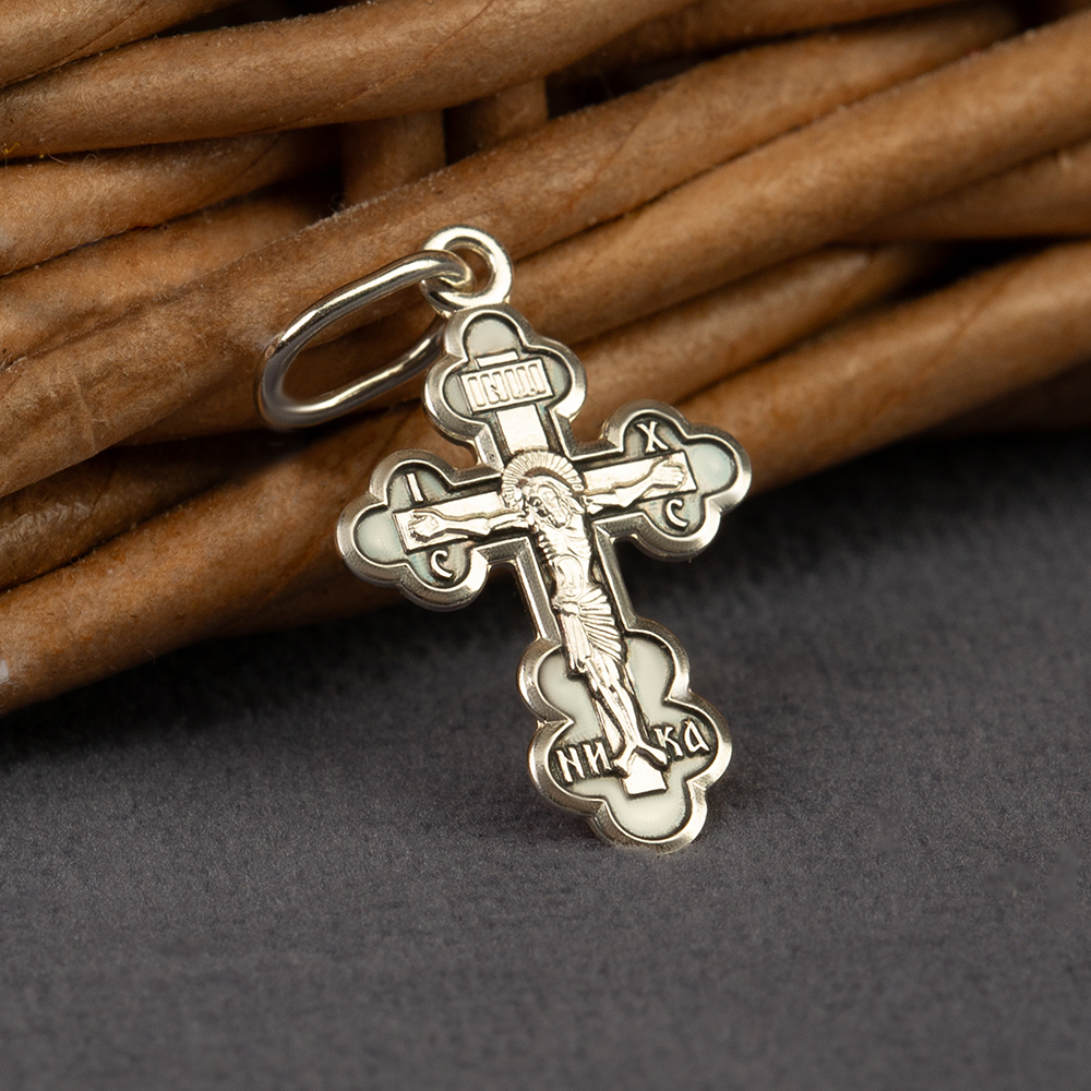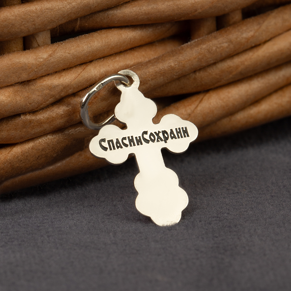 Нательный крест традиционной четырехконечной формы изготовлен из серебряного сплава методом штамповки. На лицевой стороне выполнено изображение Распятия с надписаниями, на обратной имеется текст молитвы «Спаси и сохрани». Фон лицевой стороны обработан по технологии частичного чернения. Необычную форму изделия подчеркивает рельефная рамка с узорами. Широкая петля в верхней части подходит и под широкую цепь, и под плетеный гайтан.