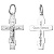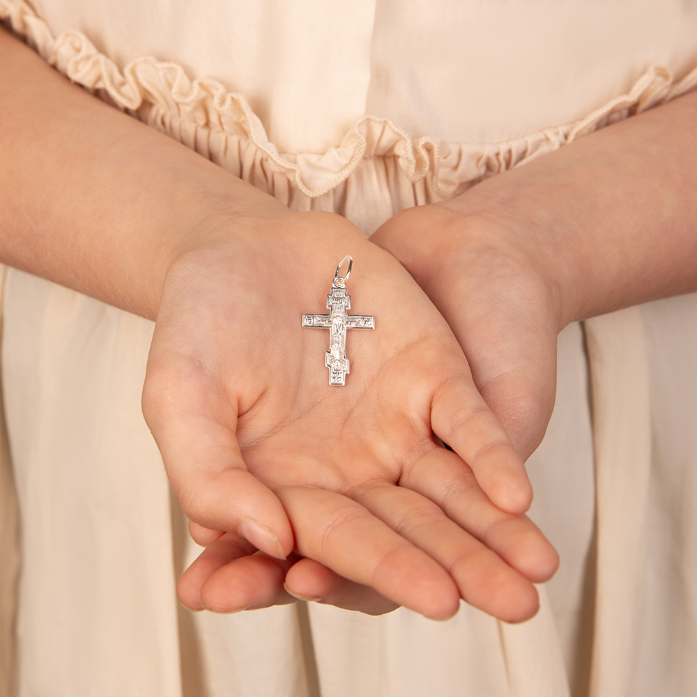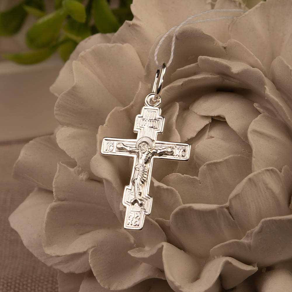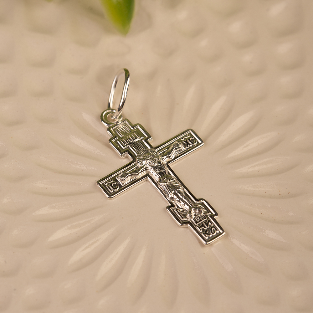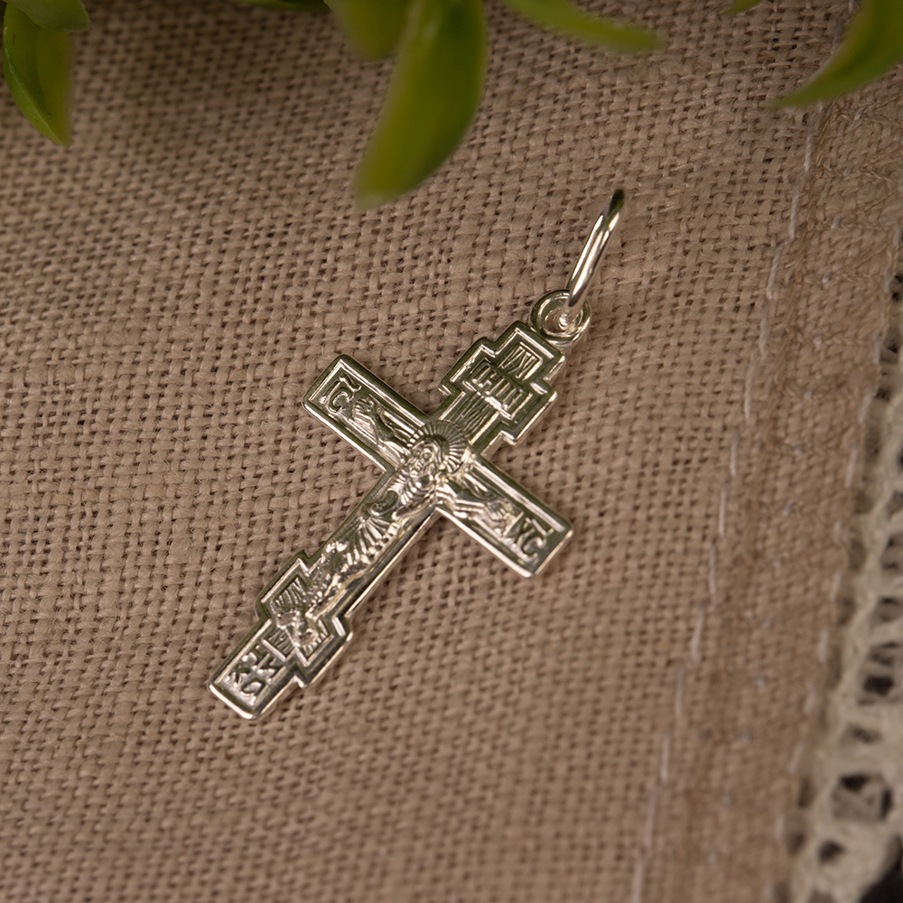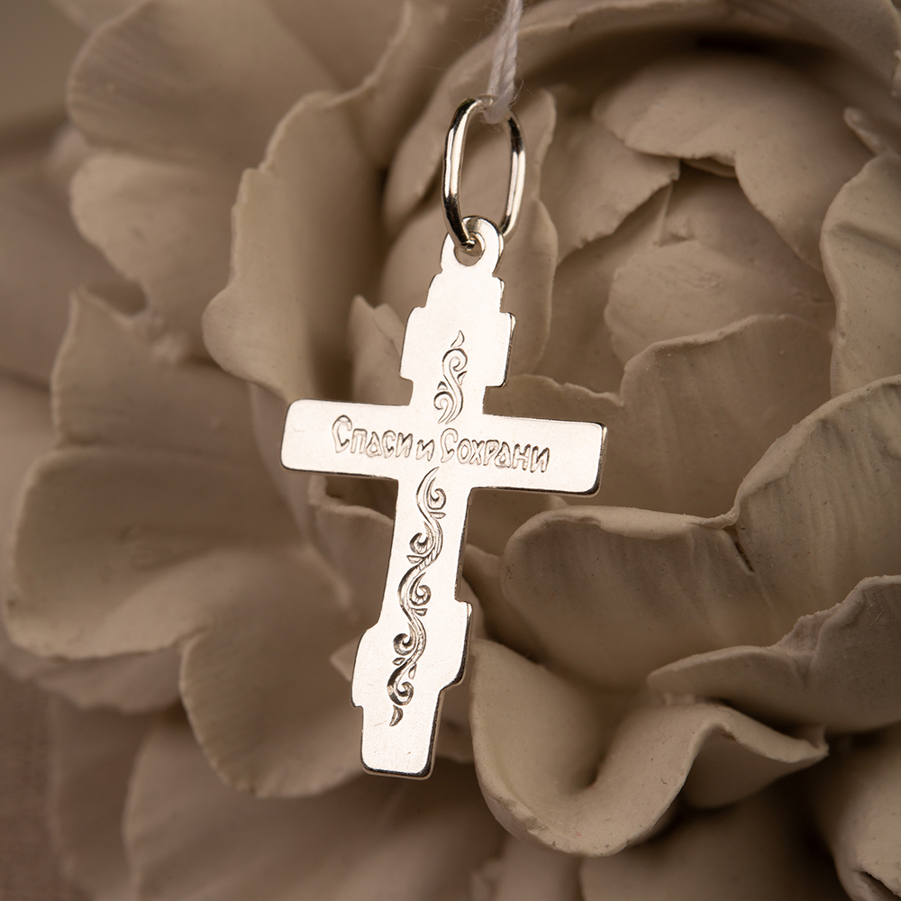 Нательный крест изготовлен по технологии штамповки с использованием качественного серебряного сплава. Изделие классической четырехконечной формы. На лицевой стороне выполнено изображение Распятия с надписаниями, обратная сторона отполирована и украшена витым узором, на горизонтальной перекладине выполнена надпись в виде краткой молитвы «Спаси и сохрани». Для ношения креста предусмотрена широкая проволочная петля, под которую несложно подобрать гайтан или цепь нужного диаметра.