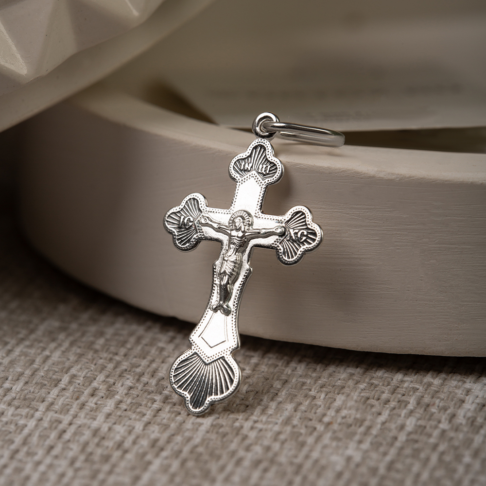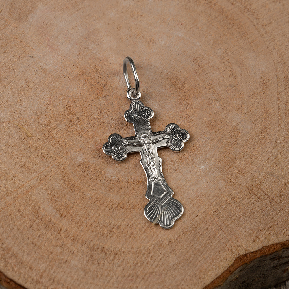 Нательный крест четырехконечной формы изготовлен из серебра методом штамповки. На лицевой стороне выполнено изображение Распятия с традиционными надписаниями. Рельеф текстов и изображений подчеркивает фон, обработанный по технологии частичного чернения. На тщательно отполированной обратной стороне изображен несложный узор, который дополняет текст краткой православной молитвы «Спаси и сохрани». Для ношения креста предусмотрена широкая проволочная петля.