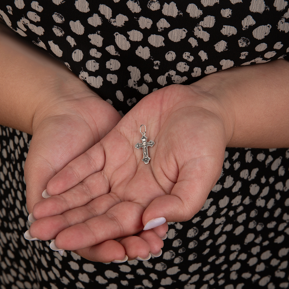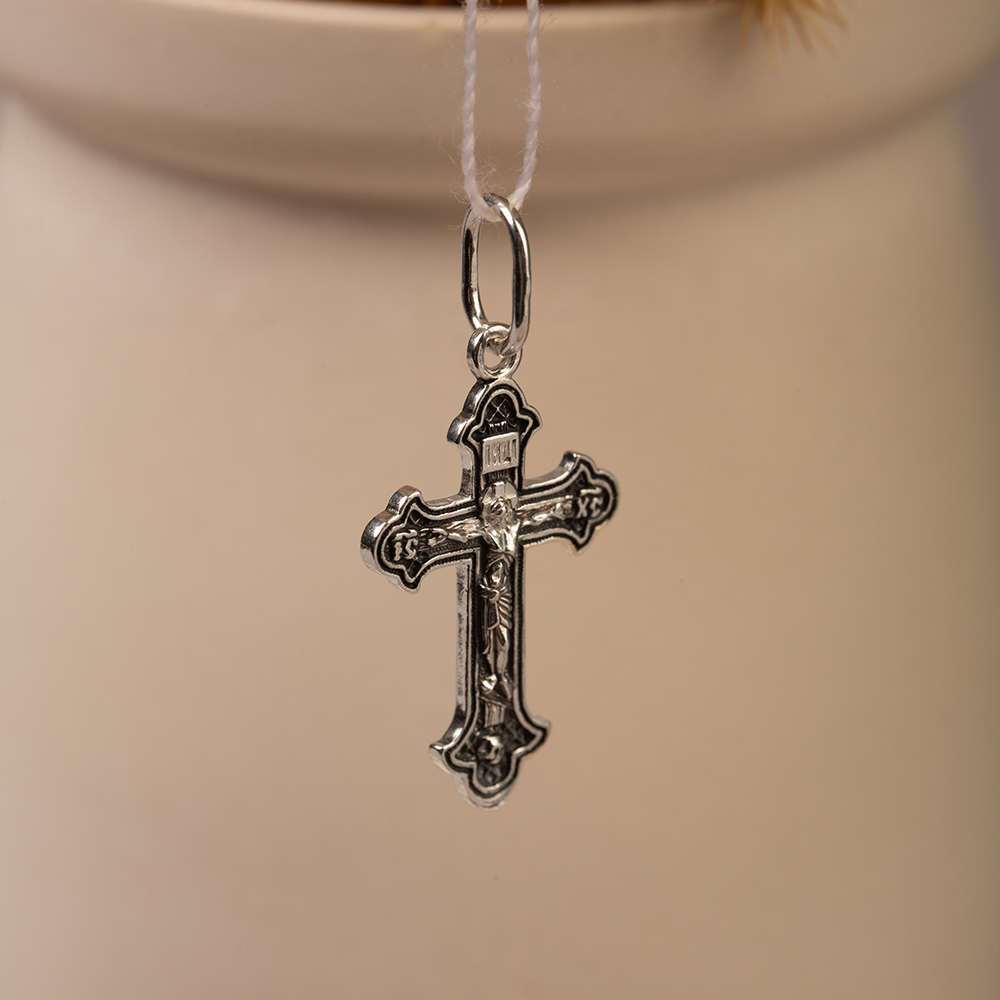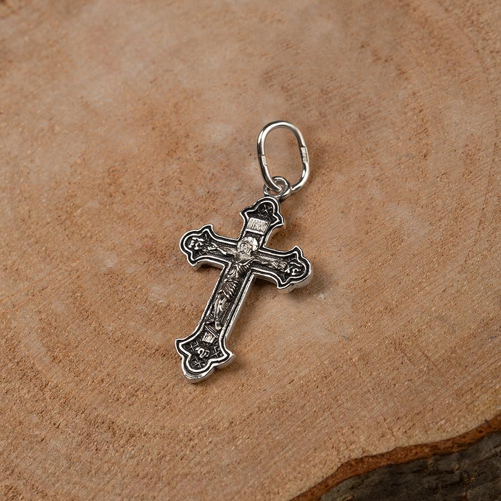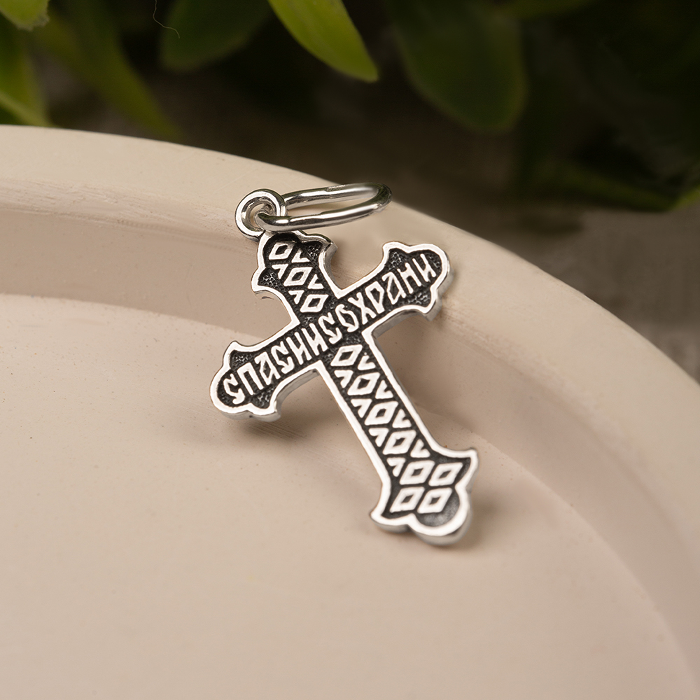 Нательный крест классической четырехконечной формы изготовлен из серебра методом литья. На его лицевой поверхности выполнено рельефное изображение Распятия с высокой степенью детализации. На горизонтальную перекладину с обратной стороны нанесена надпись с текстом молитвенного обращения «Спаси и сохрани», которую дополняет вертикальный геометрический узор. Фоновая часть креста с обеих сторон обработана по технологии частичного чернения, что подчеркивает рельефность текста и изображений. Для подвешивания креста предусмотрена широкая вытянутая петля.