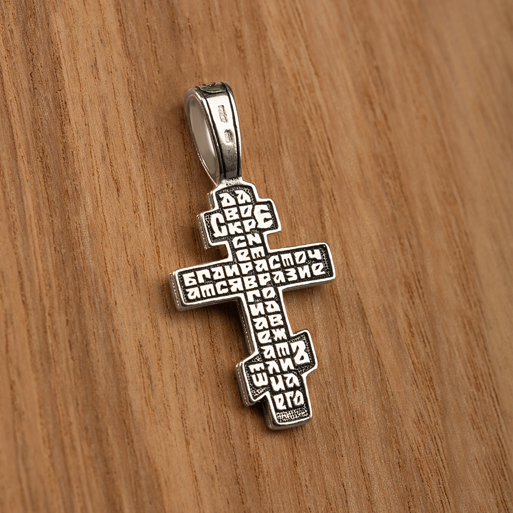 Нательный крест традиционной восьмиконечной формы изготовлен по технологии литья из ювелирного серебра. На лицевой стороне выполнено рельефное изображение Распятия с надписаниями, в верхней части помещена икона «Спас Нерукотворный». Поверхность обратной стороны заполняет начало текста стихиры Пасхи «Да воскреснет Бог». Для подвешивания креста в верхней части изделия предусмотрено приварное ушко с рельефным узором.
