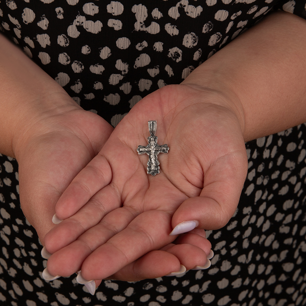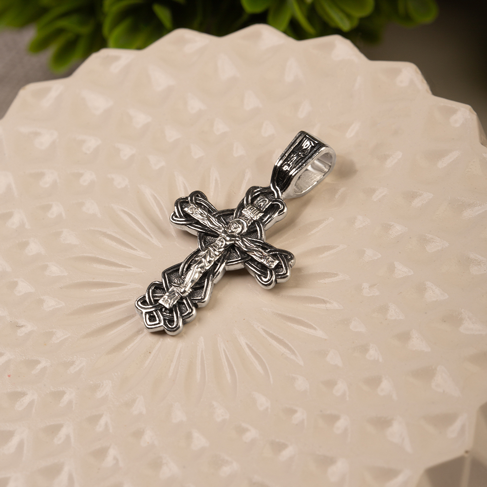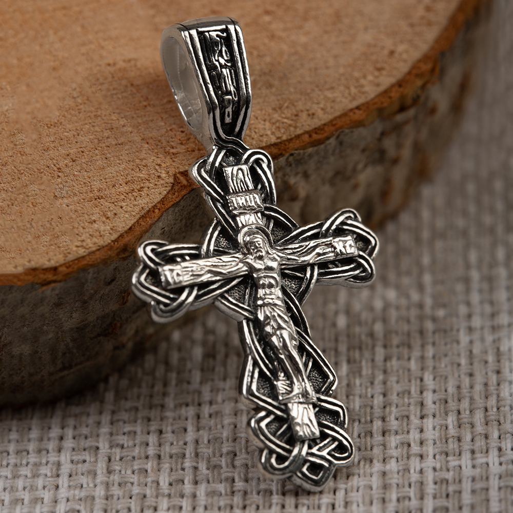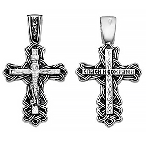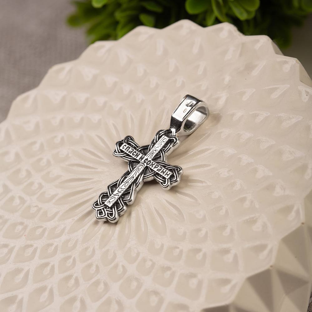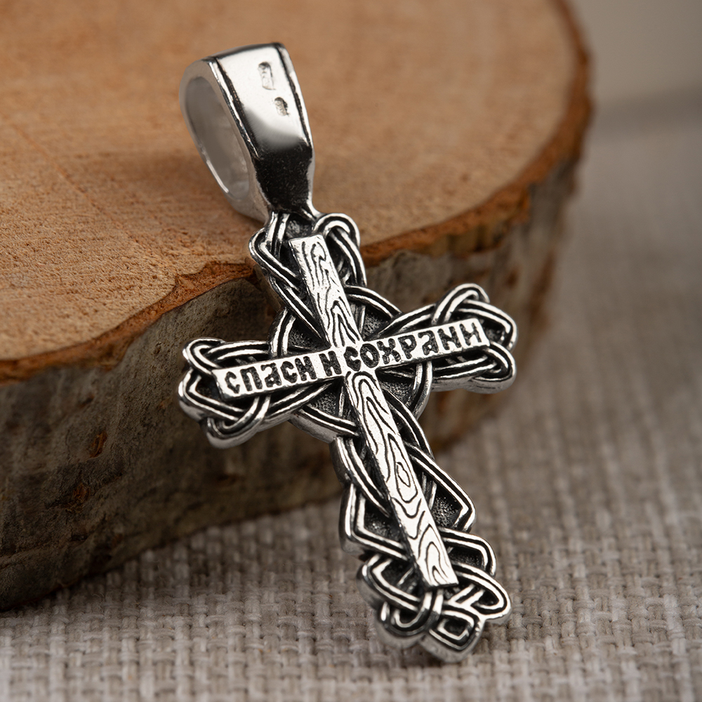 Нательный крест изготовлен из качественного ювелирного серебра по технологии литья. Его главное украшение — оригинальное плетение, которое окружает перекладины по периметру. На лицевой части выполнено детализированное изображение Распятия с надписаниями, на обратной – узор с имитацией среза древесины и текст краткой молитвы «Спаси и сохрани». Пространство между плетениями обработано по технологии чернения. Широкое ушко для подвешивания и ношения креста украшает рельефный узор, созвучный основному мотиву.
