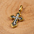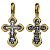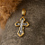 Небольшой нательный крест изготовлен из ювелирного серебра по технологии литья. На лицевой стороне выполнено рельефное изображение Распятия с традиционными надписаниями, которое смотрится более выразительно благодаря искусственно затемненному фону. Обработка контуров изделия по технологии позолоты подчеркивает его необычную форму. Для ношения в верхней части креста имеется высокое ушко, для которого подойдет цепь любой ширины.