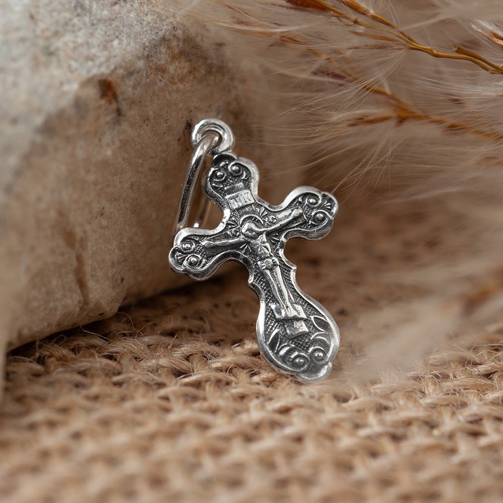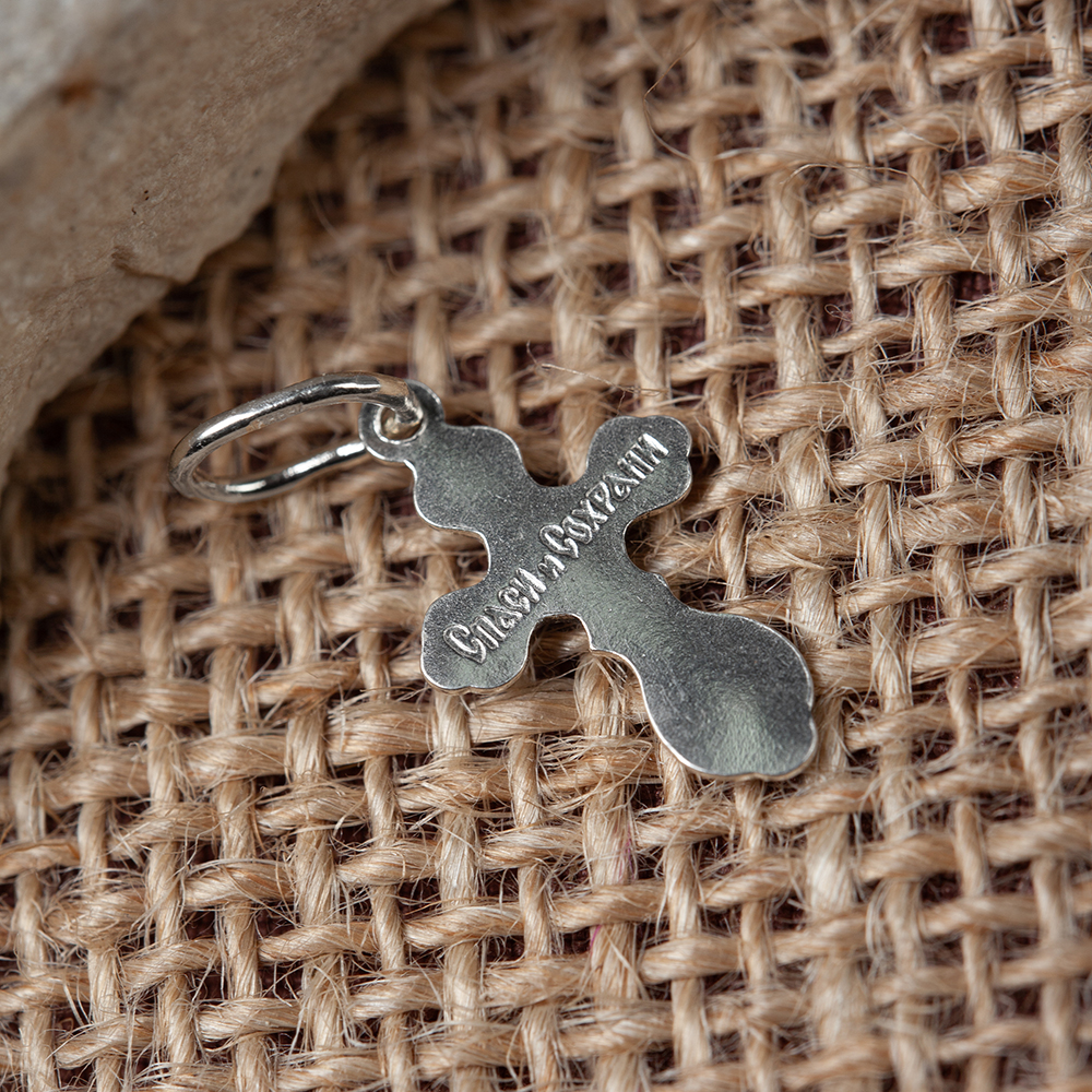 Нательный крест традиционной четырехконечной формы изготовлен из серебряного сплава методом штамповки. На лицевой стороне выполнено изображение Распятия с надписаниями, на обратной имеется текст молитвы «Спаси и сохрани». Фон лицевой стороны обработан по технологии частичного чернения. Необычную форму изделия подчеркивает рельефная рамка с узорами. Широкая петля в верхней части подходит и под широкую цепь, и под плетеный гайтан.