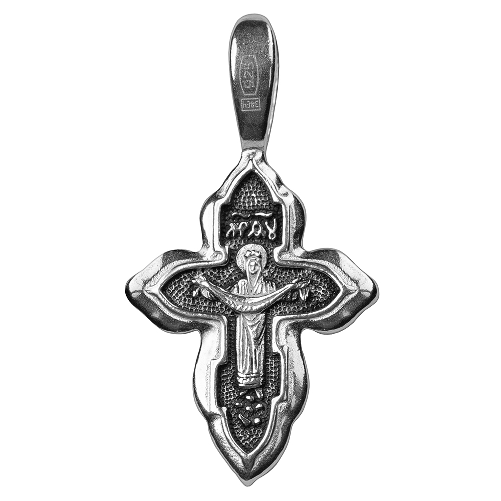 Нательный крест изготовлен из качественного серебряного сплава по технологии литья. Оригинальное изделие небольших размеров имеет широкую рельефную рамку по краю. На лицевой стороне выполнено детализированное изображение Распятия, на обратной – икона Покрова Божией Матери. Фон вокруг изображений обработан по технологии частичного чернения. Для подвешивания креста в верхней части предусмотрено цельное каплевидное ушко.