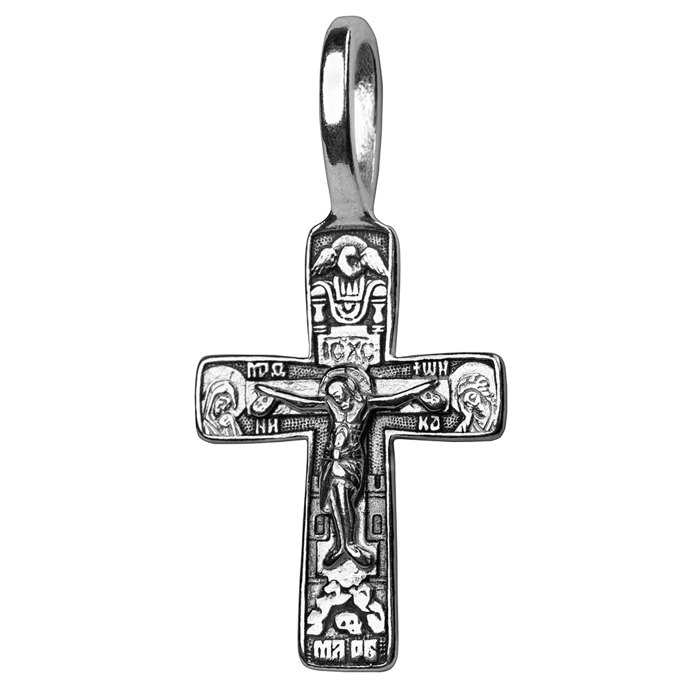 На лицевой стороне креста вы видите образ распятого Христа с предстоящими Ему Богоматерью и апостолом Иоанном Богословом. Их лики нанесены на боковые перекладины креста. Вверху – голубь, символ Святого Духа. На оборотной стороне крестика – изображение одного из наиболее почитаемых в России святых, преподобного Сергия Радонежского. Носить такой крест можно не только тем, кто крещён с именем Сергий, но и всем почитающим этого великого святого.