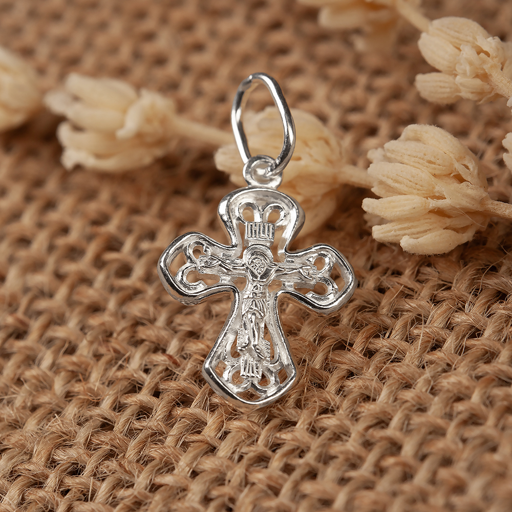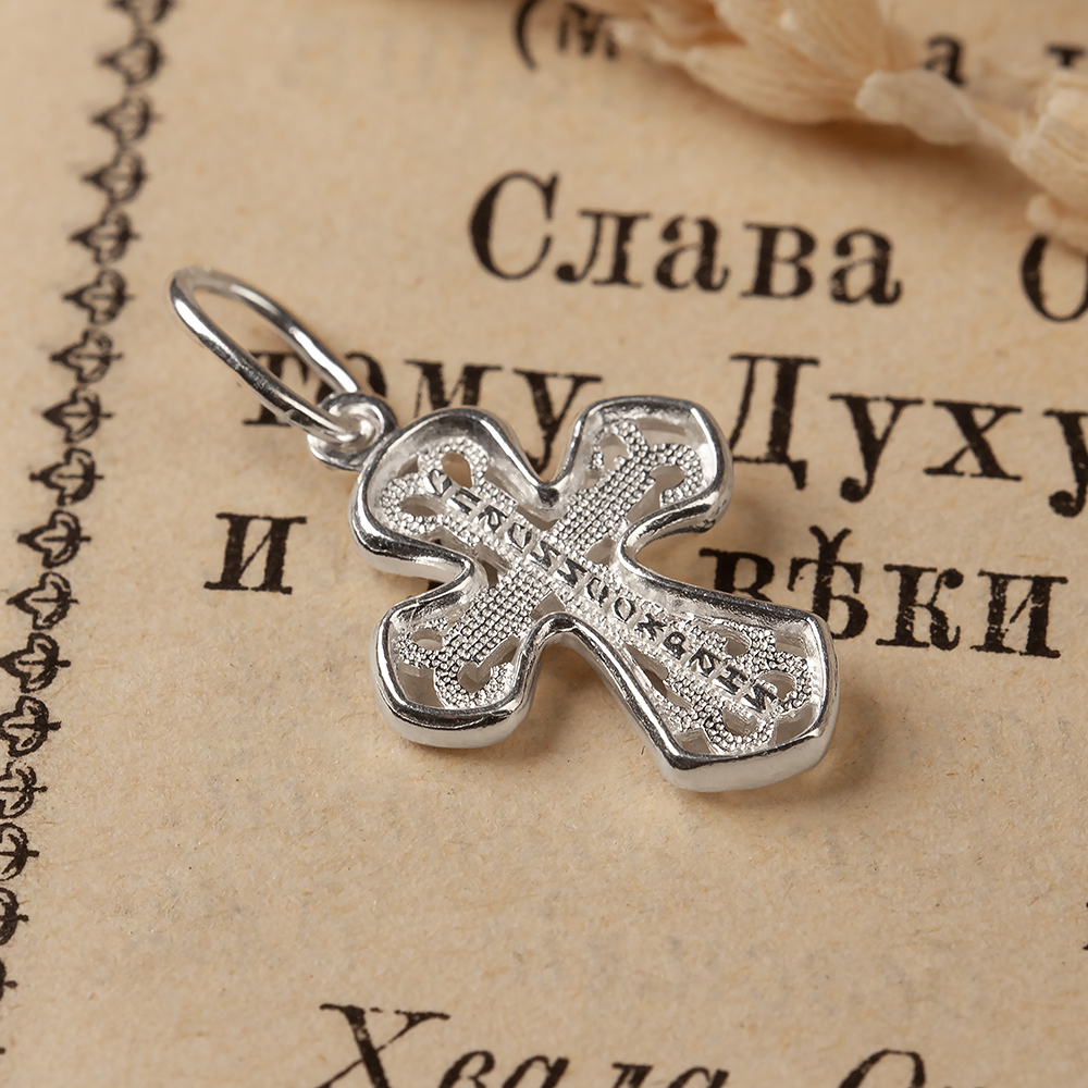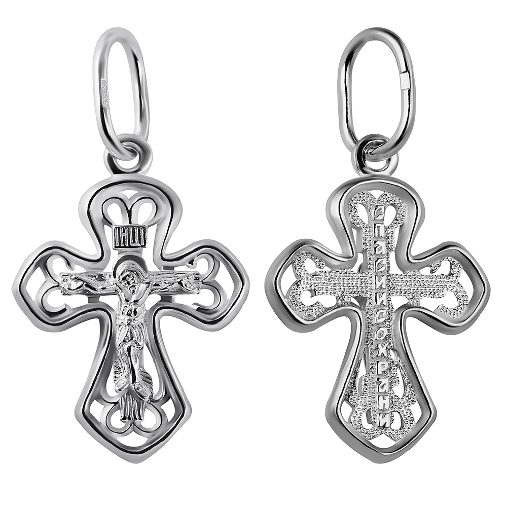 Нательный белый крест изготовлен из качественного ювелирного серебра по технологии литья. Форму его перекладин, расширяющихся к концам, дополняют изогнутые вставки. На лицевой стороне имеется детализированное изображение Распятия с традиционными надписаниями, на обратной — текст молитвенного обращения «Спаси и сохрани», а остальной фон заполнен имитацией чеканного узора. Для ношения креста в верхней части имеется вытянутое широкое ушко.