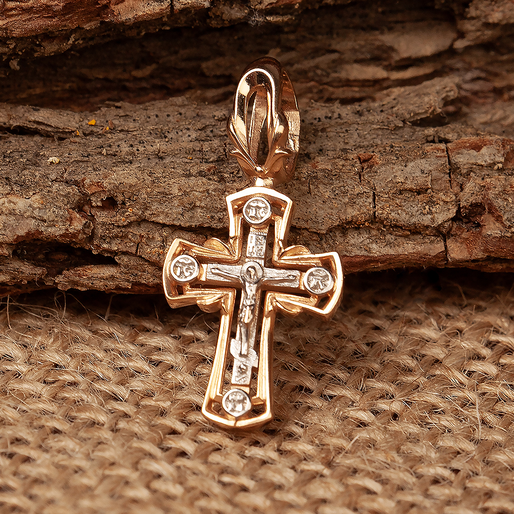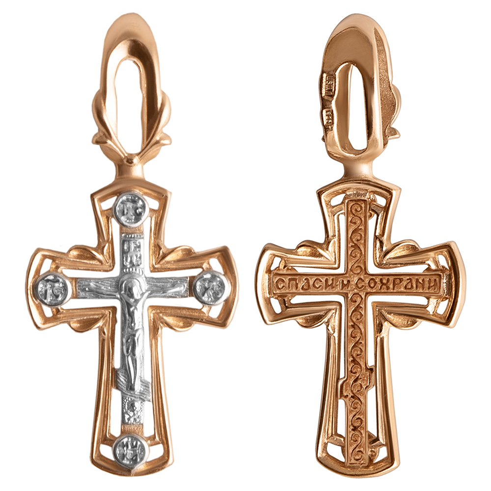 Нательный крест в традиционном русском стиле изготовлен из серебра. На лицевой части выполнено изображение Распятия с надписаниями, которое отличается высокой степенью детализации. Обратную сторону заполняют несложный узор и текст молитвы «Спаси и сохрани». Рамки, обрамляющие крест по периметру, расширяются к краям, что визуально увеличивает размеры изделия. Для подвешивания креста на цепь или гайтан в верхней части предусмотрена приварная петля, которую аккуратно обвивают небольшие «ветви».