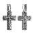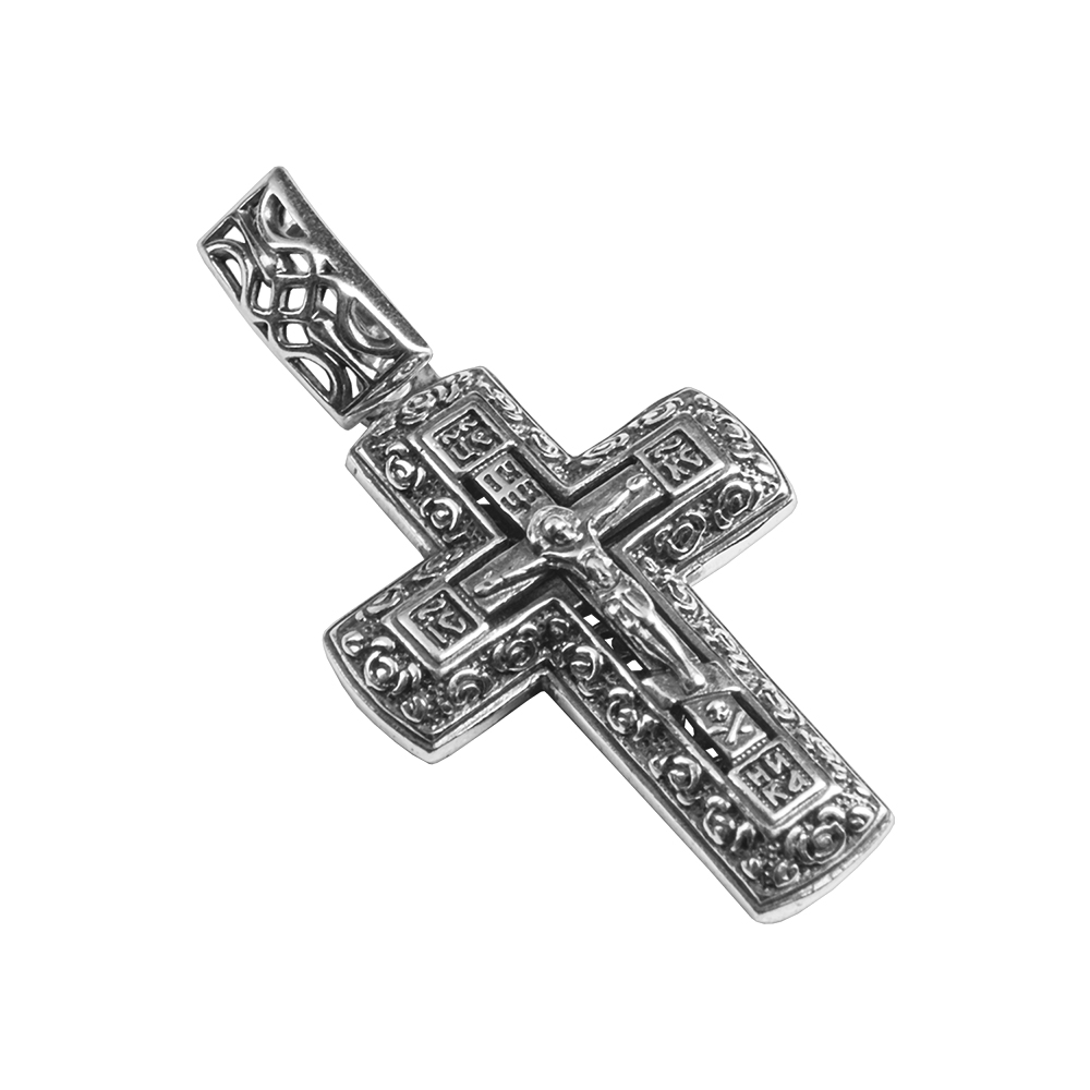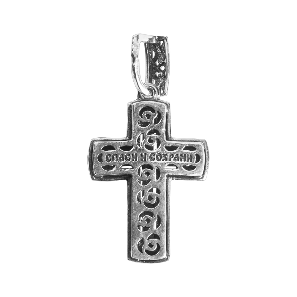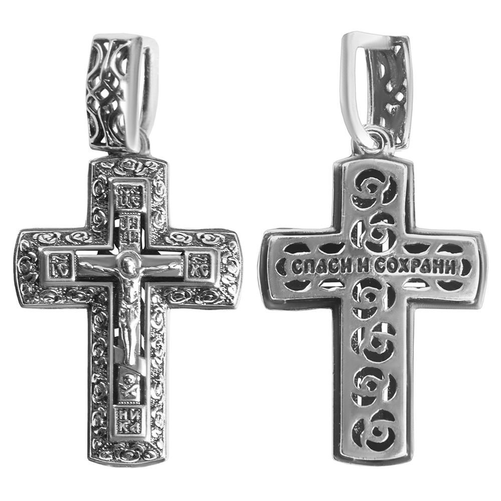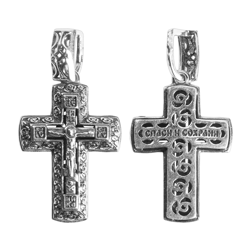 Двусторонний нательный крест изготовлен из качественного ювелирного сплава. Две его части наложены друг на друга и идеально совмещены по краям. На лицевой стороне выполнено детализированное изображение Распятия с надписаниями, помещенное в широкую рельефную рамку с несложным узором. Обратную сторону украшают прорезной орнамент и текст православной молитвы «Спаси и сохрани». Ушко для ношения в верхней части креста украшает узор, повторяющий орнамент на основной части изделия.