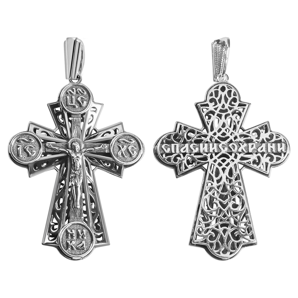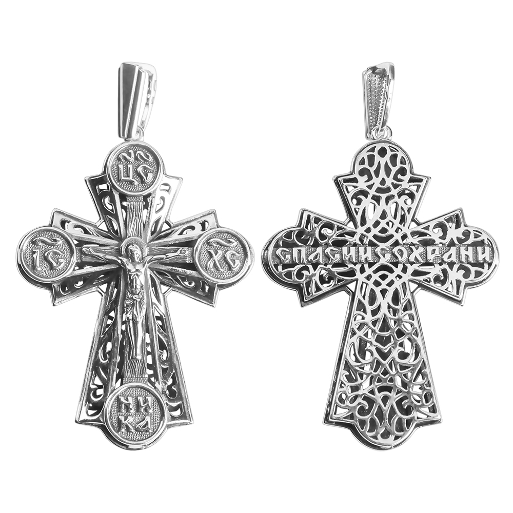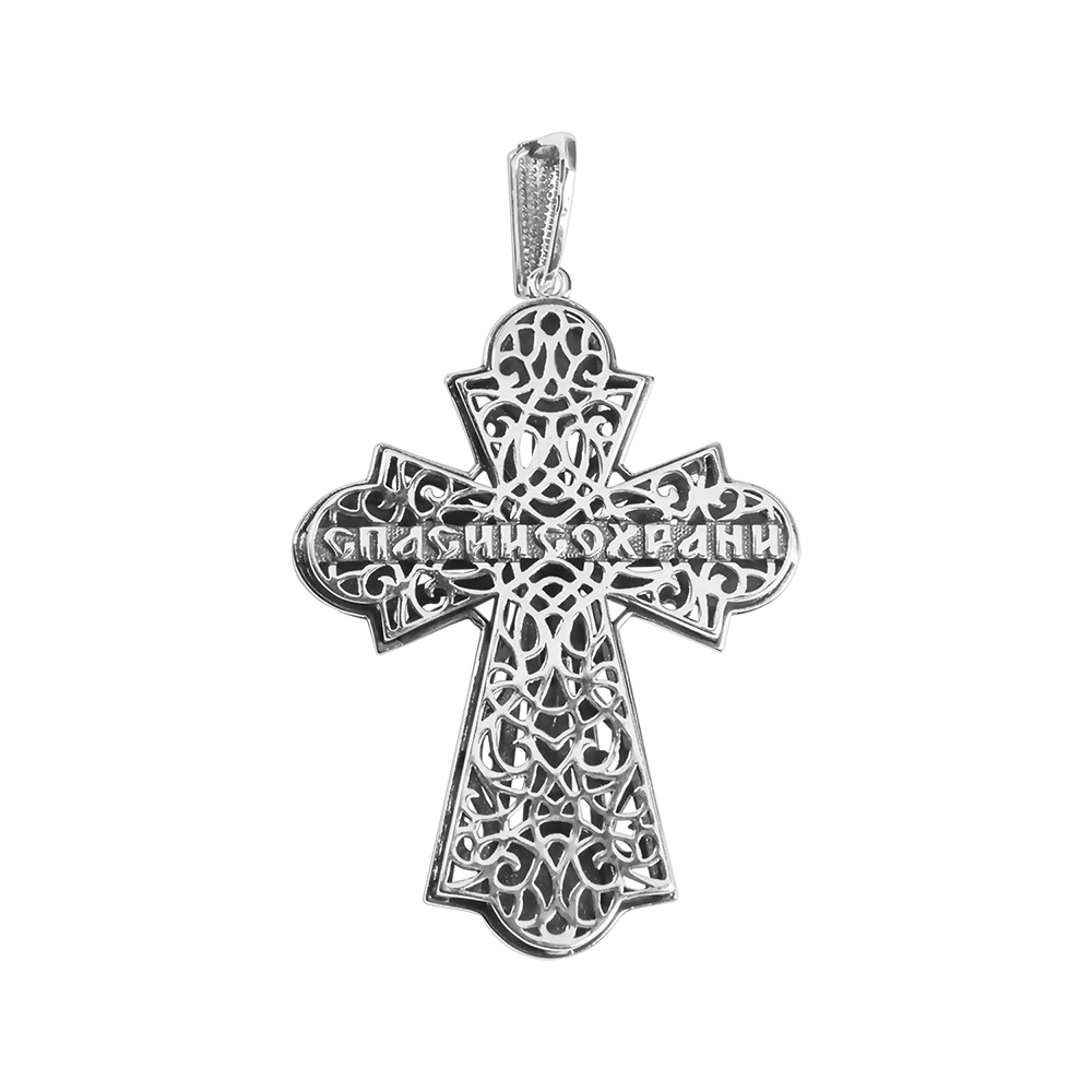 Двусторонний нательный крест изготовлен из качественного ювелирного сплава. Его главная особенность – необычная рельефная фактура, собранная из переплетающихся линий. На лицевой стороне выполнено детализированное изображение Распятия с надписаниями, на поверхность обратной нанесен текст молитвы «Спаси и сохрани». Для ношения креста предусмотрено ушко, передняя часть которого выполнена в виде узора, повторяющего основной рисунок.