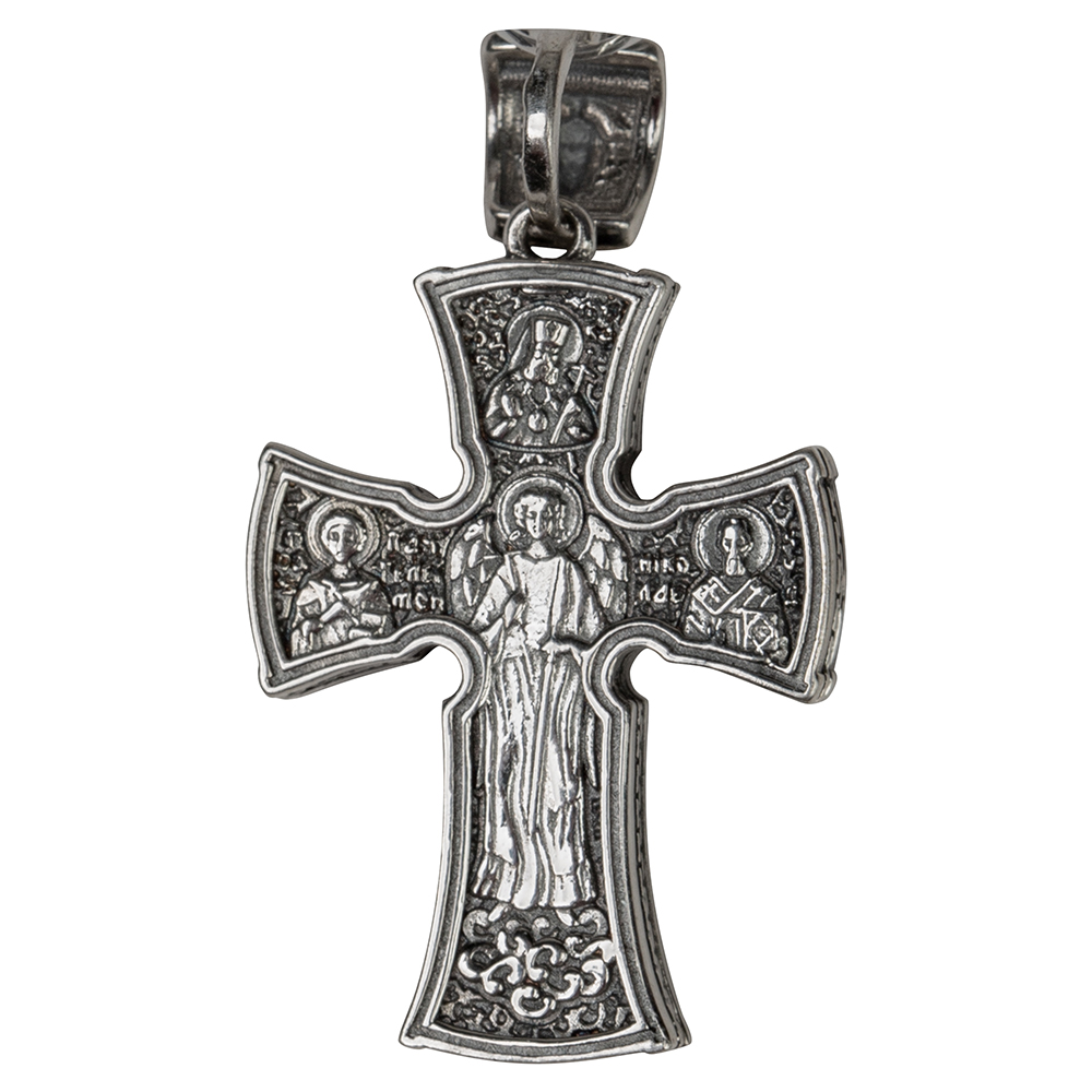 Нательный крест изготовлен из ювелирного серебряного сплава. Изделие имеет оригинальную форму с перекладинами, которые расширяются от центра к краю. На лицевой стороне имеется рельефное изображение Распятия с высокой степенью детализации, на обратной — изображения Ангела и чтимых святых. Необычную форму креста дополнительно подчеркивает двойная тонкая рамка по периметру изделия. Фон изделия обработан по технологии чернения, что придает изображениям дополнительный объем. Широкое округлое ушко для подвешивания креста украшает икона Спаса Нерукотворного.