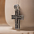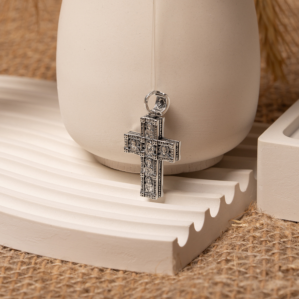 Нательный крест четырехконечной формы изготовлен из качественного ювелирного серебра. Лицевую сторону заполняет детализированное изображение Распятия с традиционными надписаниями, обратную — изображения Божией Матери и чтимых святых. С обеих сторон по периметру выполнена широкая рамка, заполненная несложным геометрическим узором. Свободное пространство обработано по технологии чернения, что делает изображения еще заметнее и читабельнее. Широкое ушко для навешивания креста украшает икона Спаса Нерукотворного.