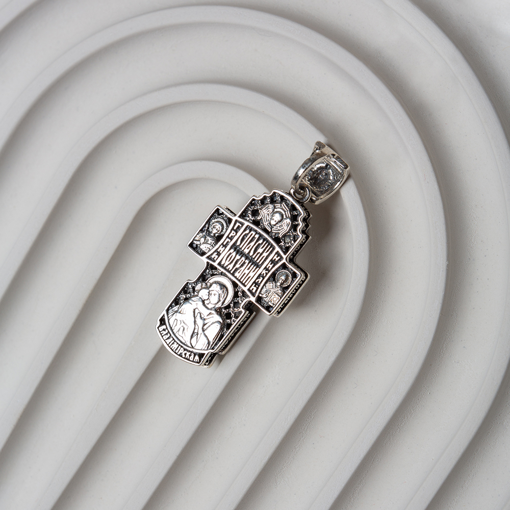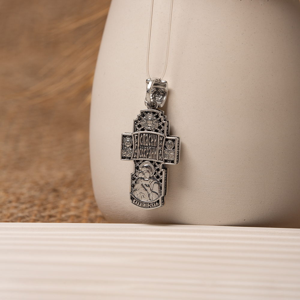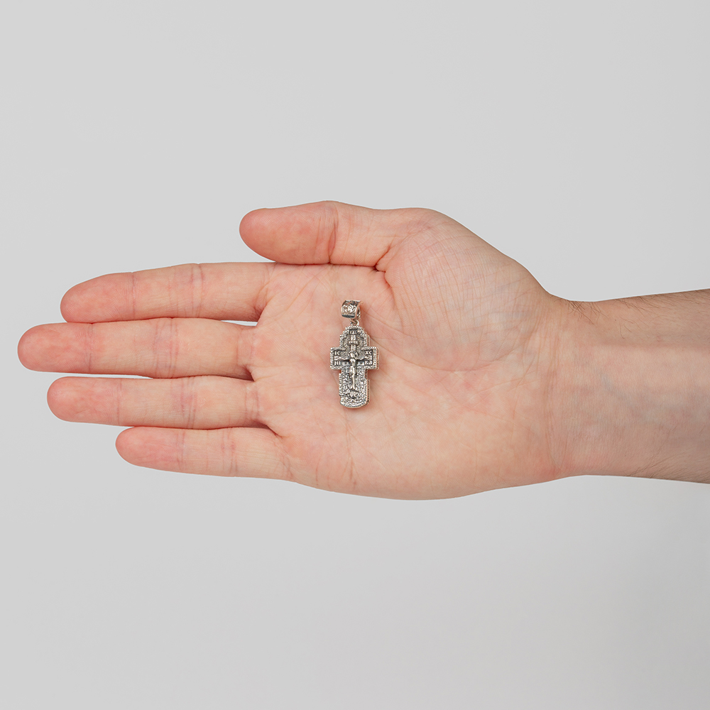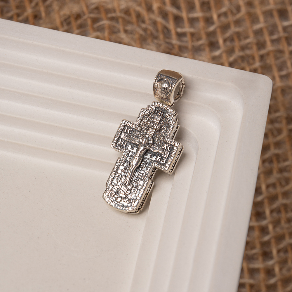 Нательный крест изготовлен из качественного серебряного сплава. Изделие отличается необычной формой за счет широкой вертикальной и укороченной горизонтальной перекладин. На лицевой стороне выполнено детализированное изображение Голгофы с надписаниями, По периметру нанесен текст 67 псалма «Да воскреснет Бог». С обратной стороны имеются несколько икон: Владимирская Божией Матери, вмч. Георгия, свт. Николая, херувима, а также нанесен текст молитвы «Спаси и сохрани». Фон с обратной стороны заполнен квадратным орнаментом. Поверхность креста обработана по технологии чернения. Округлое ушко для подвешивания креста украшает икона Спаса Нерукотворного.