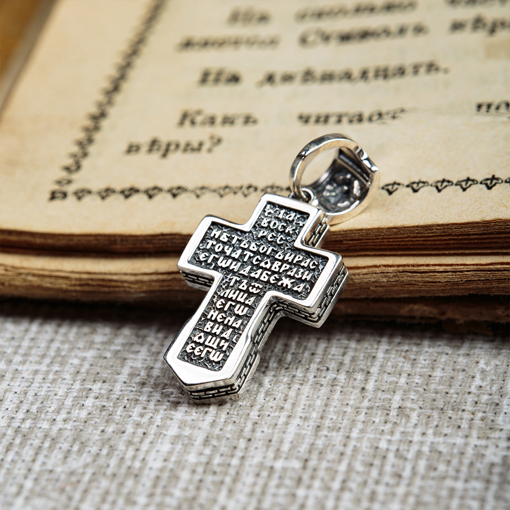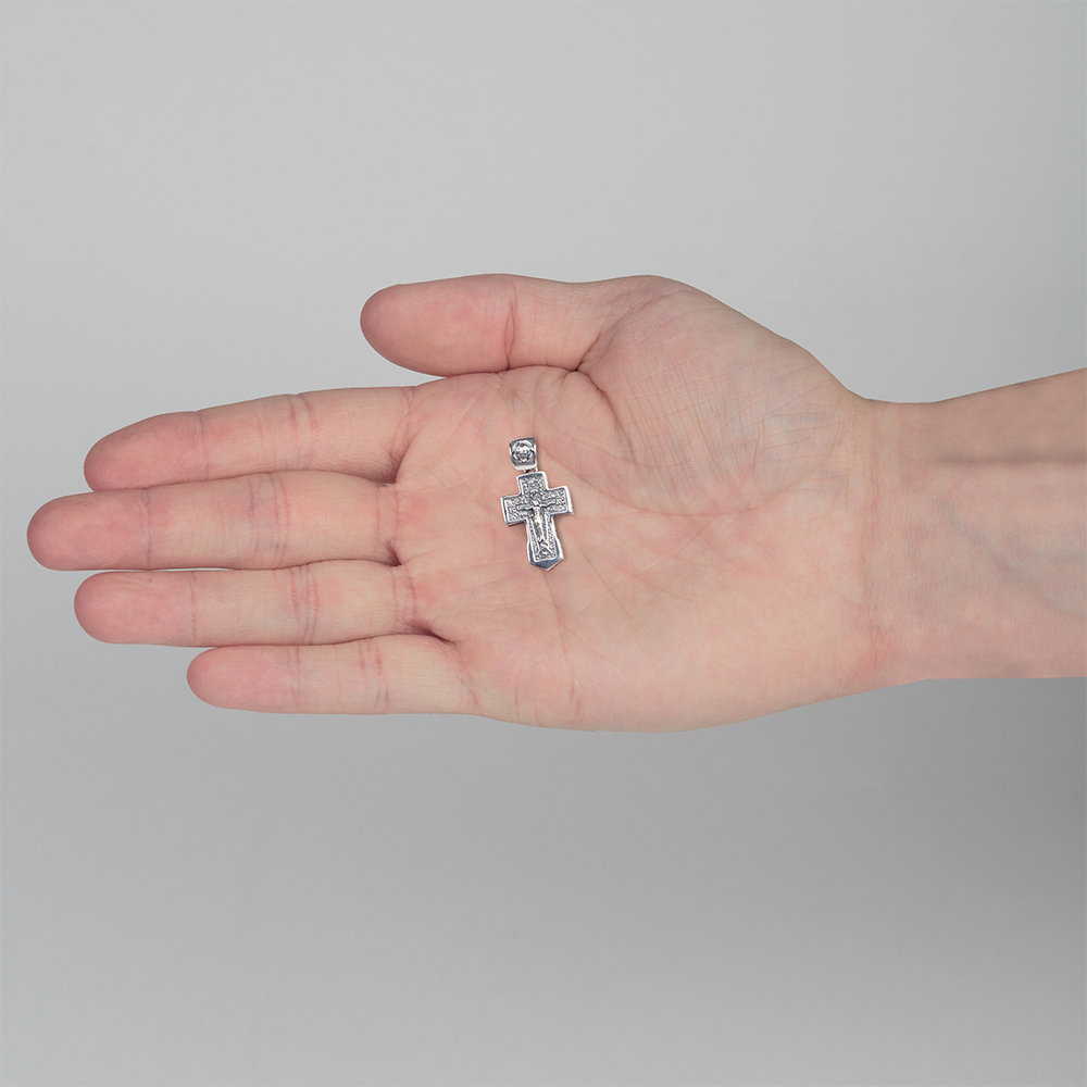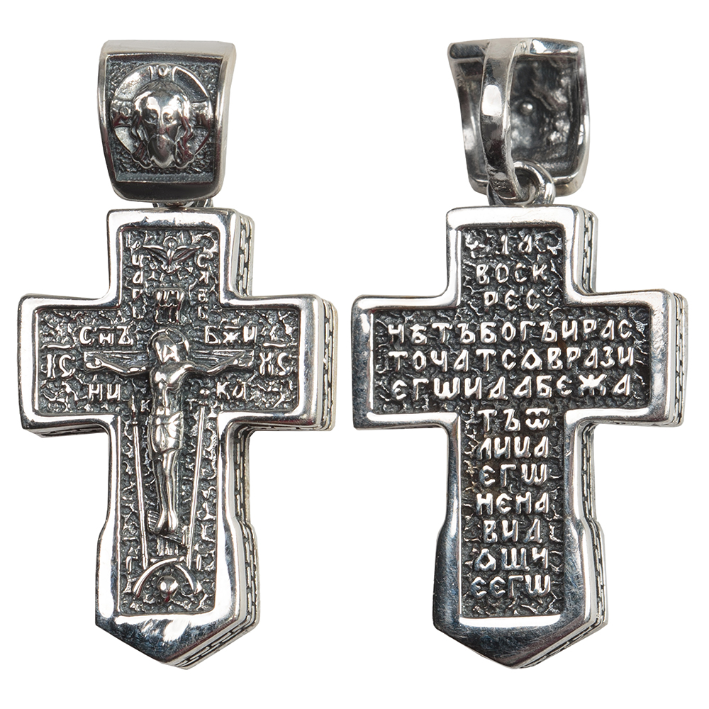 Нательный крест изготовлен из качественного ювелирного серебра. Изделие имеет классическую четырехугольную форму и чуть расширяется в нижней части. Лицевую сторону заполняет изображение Распятия с традиционными надписаниями, обратную — текст стихиры Пасхи «Да воскреснет Бог». Свободное пространство между изображениями и рамкой креста обработано по технологии чернения. По гладкой поверхности бокового среза идет несложный геометрический орнамент. Подвесное ушко для ношения креста украшает икона Спаса Нерукотворного.
