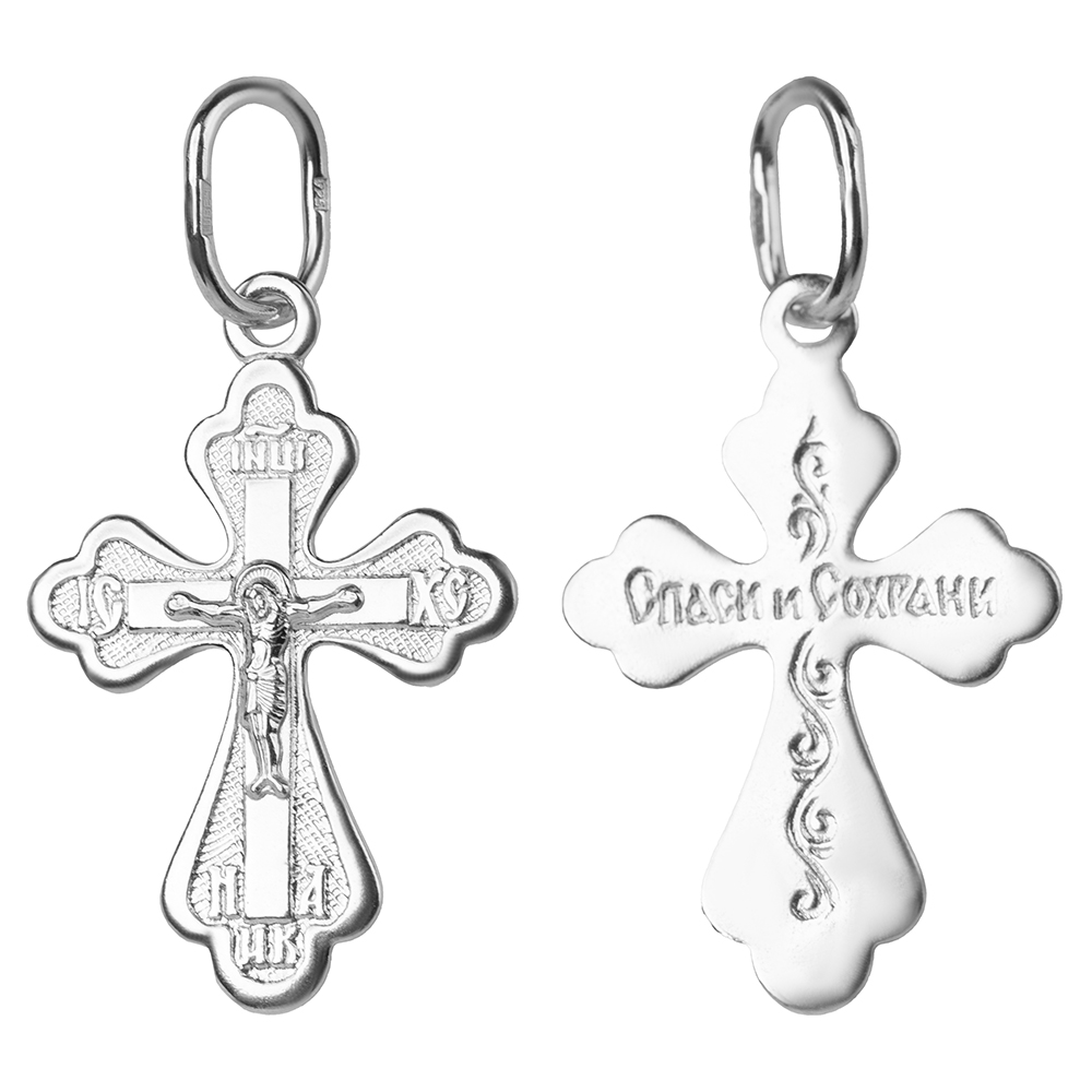 Нательный крест изготовлен по технологии штамповки с использованием качественного серебряного сплава. Изделие классической четырехконечной формы украшает изогнутая линия края, которую подчеркивает тонкая рамка. На лицевой стороне выполнено изображение Распятия с надписаниями, обратная сторона отполирована и украшена витым узором, на горизонтальной перекладине выполнена надпись в виде краткой молитвы «Спаси и сохрани». Для ношения креста предусмотрена широкая проволочная петля, под которую несложно подобрать гайтан или цепь нужного диаметра.