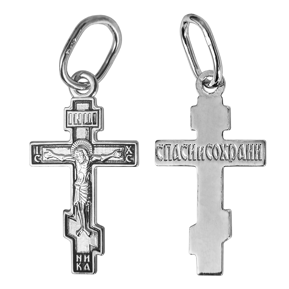 Нательный крест традиционной четырехконечной формы изготовлен из серебряного сплава методом штамповки. На лицевой стороне выполнено изображение Распятия с надписаниями, на обратной имеется текст молитвы «Спаси и сохрани». Фон лицевой стороны обработан по технологии частичного чернения. Широкая петля в верхней части подходит и под широкую цепь, и под плетеный гайтан.