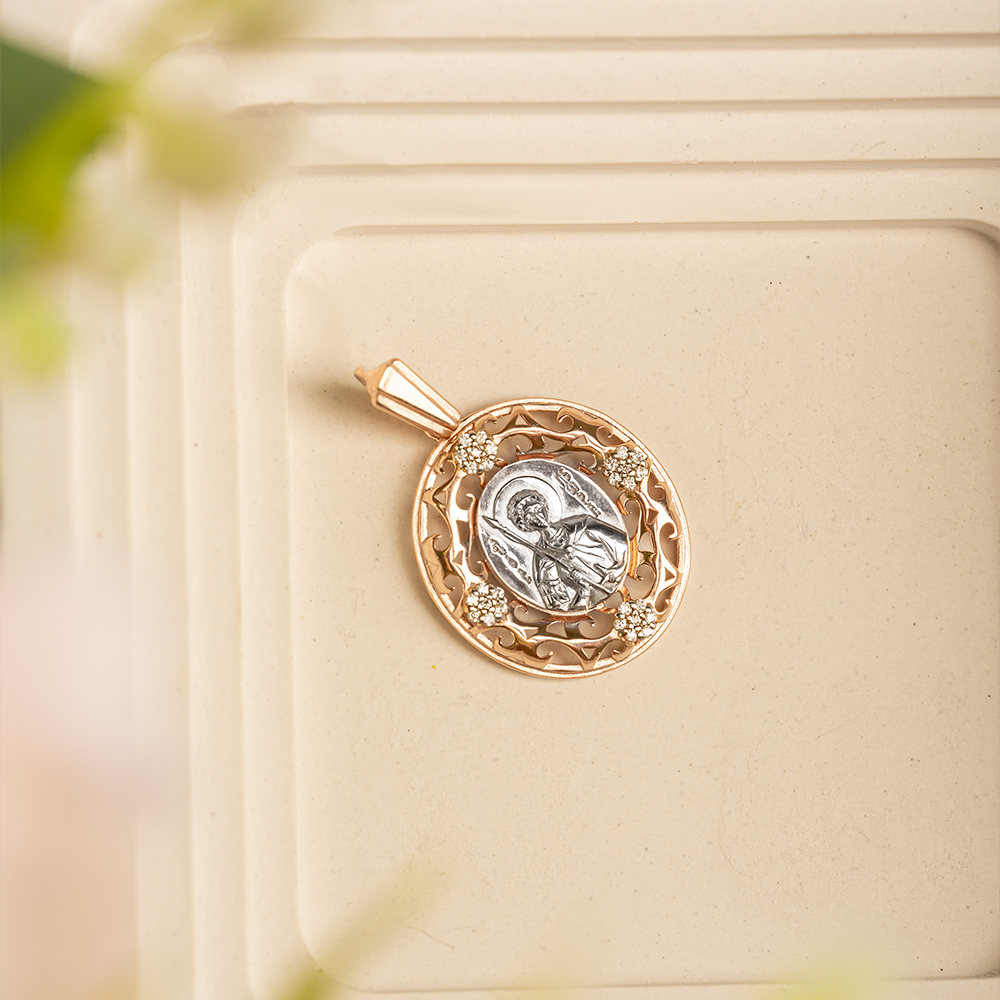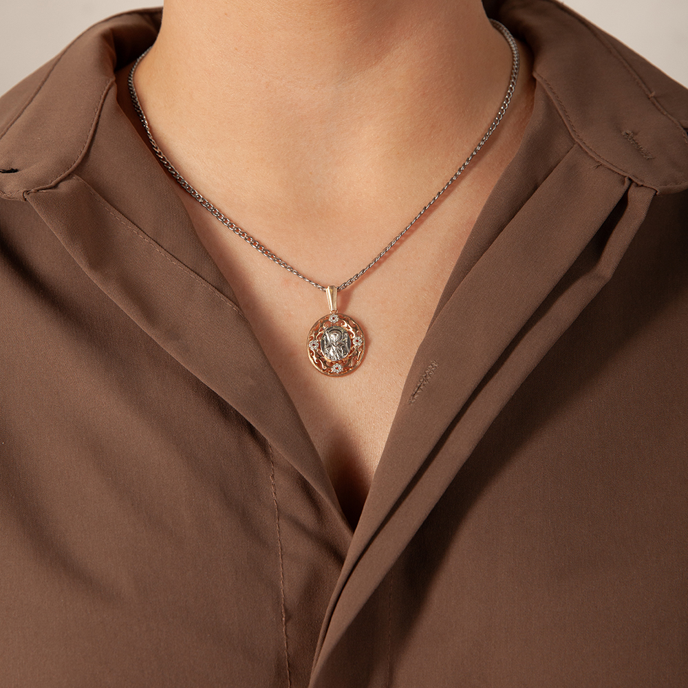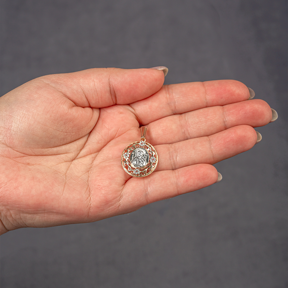 Образок с изображением святого угодника изготовлен из качественного ювелирного серебра и покрыт слоем позолоты. Икона помещена в центре в небольшой вставке овальной формы, вокруг нее выполнена широкая ажурная рамка в форме растительного орнамента. В качестве дополнительного декора использованы вставки с цветными фианитами, расположенные по кругу на равном расстоянии друг от друга. Широкое ушко для подвешивания медальона украшено плоской декоративной вставкой. Обработка поверхности изделия по технологии родирования придает поверхности приятный мягкий блеск.